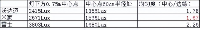 做成表格对比可以看到在距离中心点60cm半径的位置,沃达迈和米家都保持了和中心点比较接近的亮度。其中米家表现最好,在60cm外和中心点的亮度只差了1.67倍。而雷士的边缘和中心亮度差距就差得非常多了,中心和周围有两倍多的亮度差。