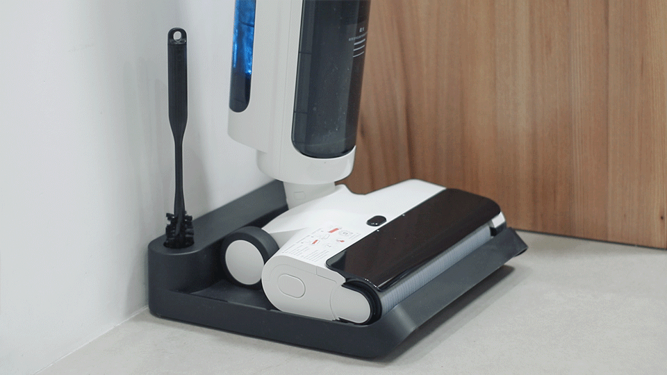 当你完成拖洗之后返回到充电基座,点按握把上的自清洁按就能开始自清洁,需要注意,由于自清洁需要电机大功率下运行滚刷、管道水路冲洗,当充电指示灯是黄色时候,需要充一会后才能开启自清洁,这所有的洗地机都是这么设计。