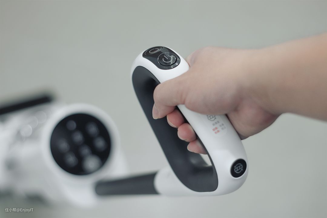 顶部三角握持区域的上面提供了电源键和模式切换键,底部有一枚自清洁按钮。操作逻辑和我之前用的洗地机一致。对了,当你开机运行时候,触地的滚刷会带来向前的自牵引力,就,感觉像遛小狗那样。一旦你微微卸力,就能轻松的开始遛洗地机来清扫了,前进后退转向都很轻便灵活,力气小的女生完全能单手无压力掌控。