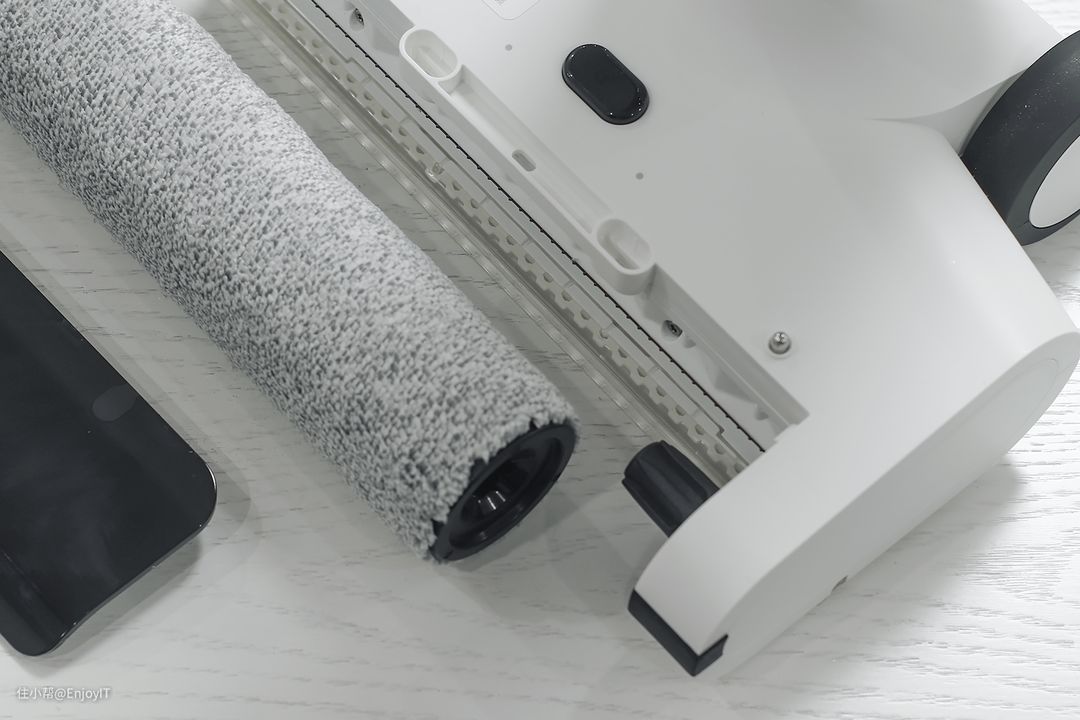 刚才应该也看到了,自清洁之前会运行电解水杀菌,这里给你们动图特写。用带杀菌的电解水冲洗滚刷,然后再离心脱水,可以有效的防止异味滋生,让你真正告别洗拖布环节。对了,如果是在南方梅雨季等高湿度日子里,建议在自清洁后拆下进一步晾晒。