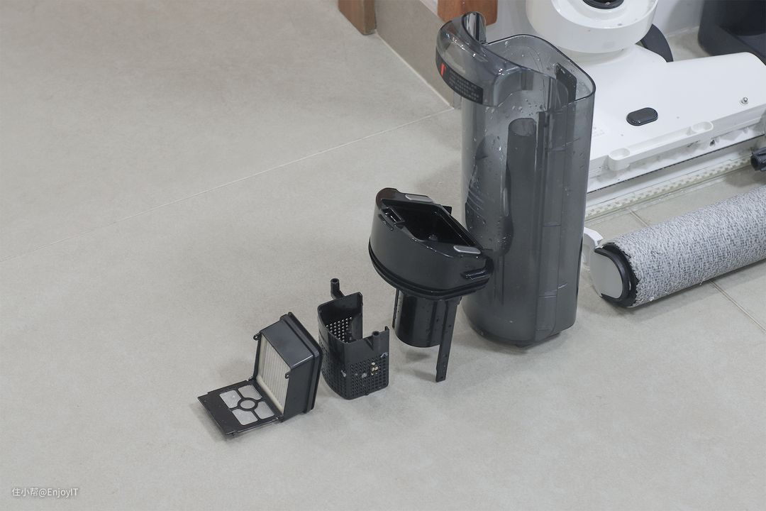 这波清扫完之后,我拆下滚刷查看过,真的很干净,长头发只有两根,也没缠绕死,轻轻拨开就行。靠近滚刷的脏污堆积,只需要定期抹掉就行。污水箱建议每次清扫完之后倾倒冲洗一下。污水箱里面还有滤芯、滤芯支架、过滤篮,实际清洗只需要倾倒冲洗下污水箱的同时,也把过滤篮附近也冲洗一下就差不多,那个小小的滤芯定期冲洗下就行。对了,需要和你们说下滤芯支架底下的水满传感器设计比我之前洗地机那种容易卡住导致误报水满的浮球传感器设计要实用的多。