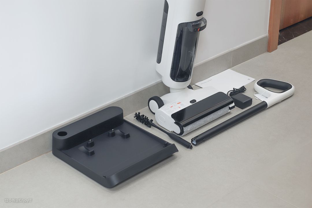 来,我们先开箱看看全家福,里面东西很简单:清洁基座、电源适配器、清洁刷(内置刮刀)、说明书、待装入的手柄、洗地机。这价位,主打一个实用,没有一个东西是多余的。