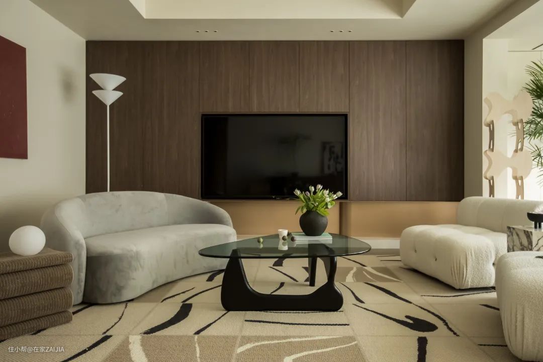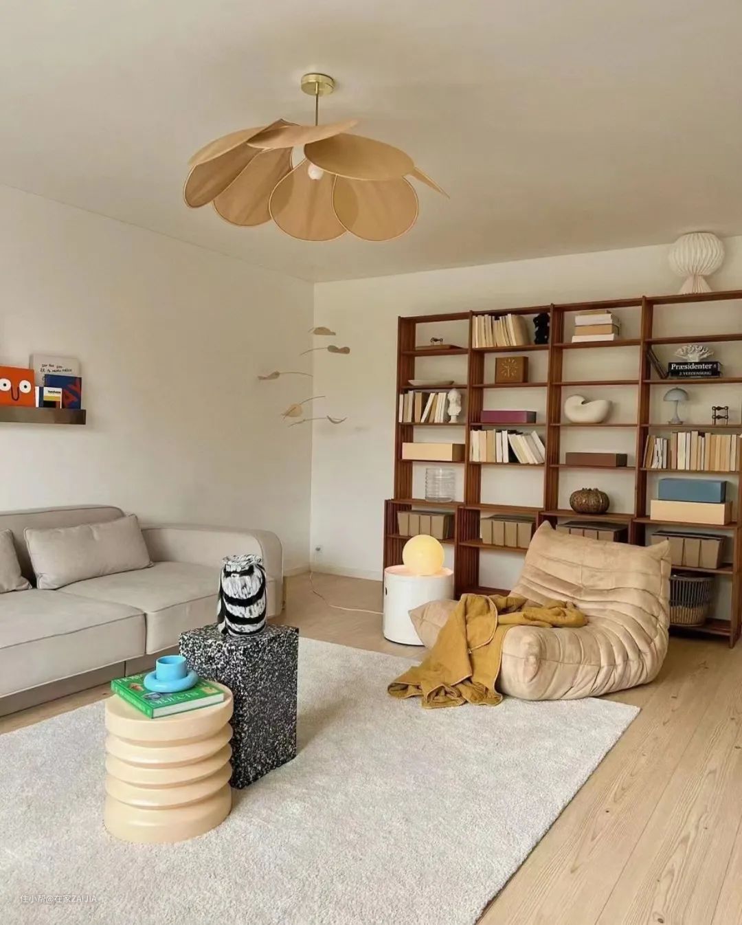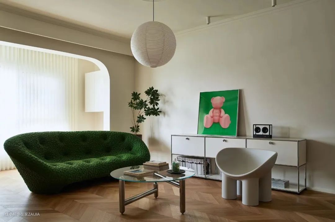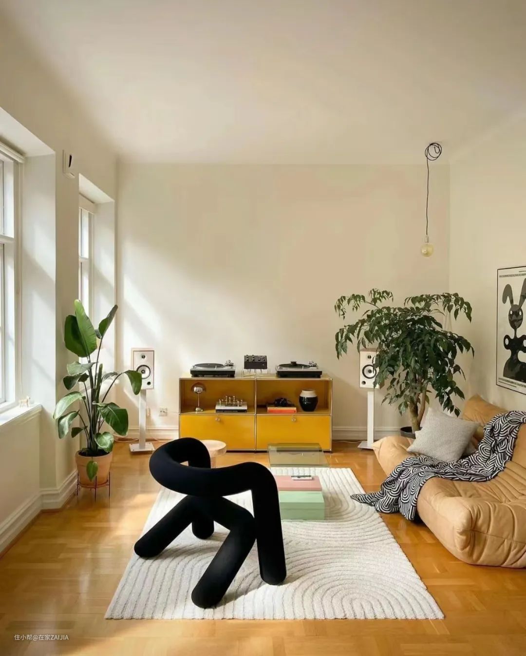 比如异形茶几,毛毛虫单人沙发椅,搭配一字型沙发,整个空间就很松弛,超有氛围感。