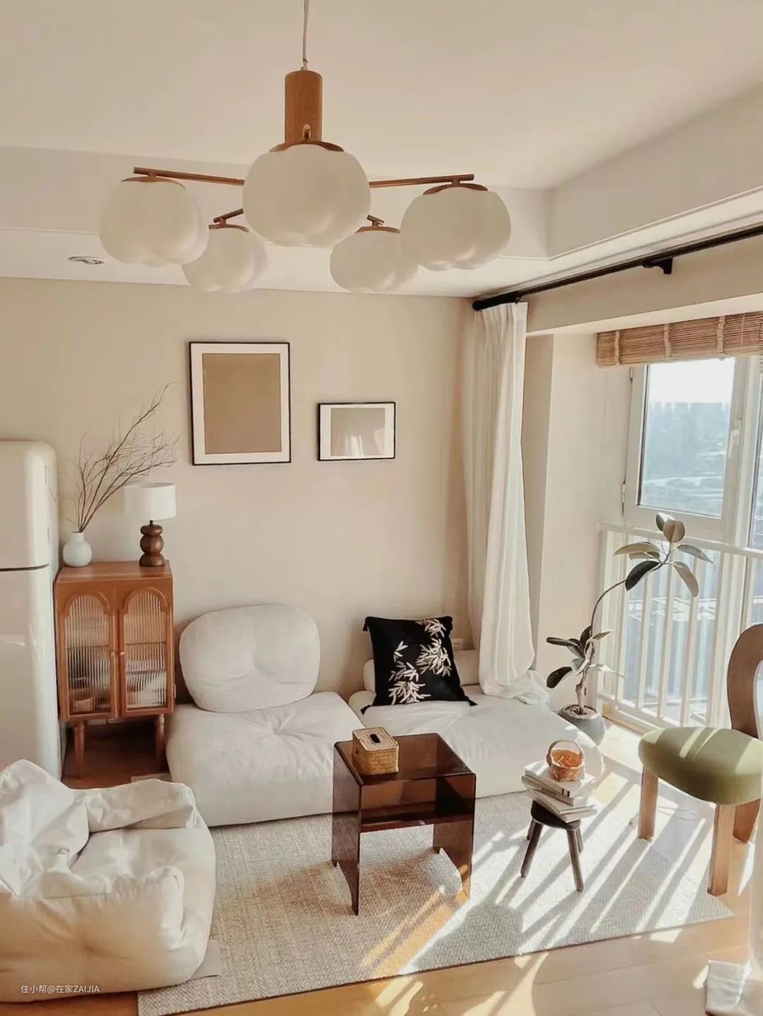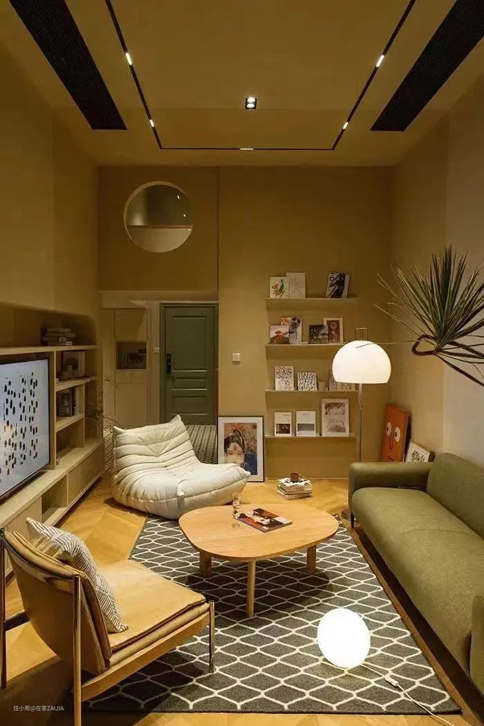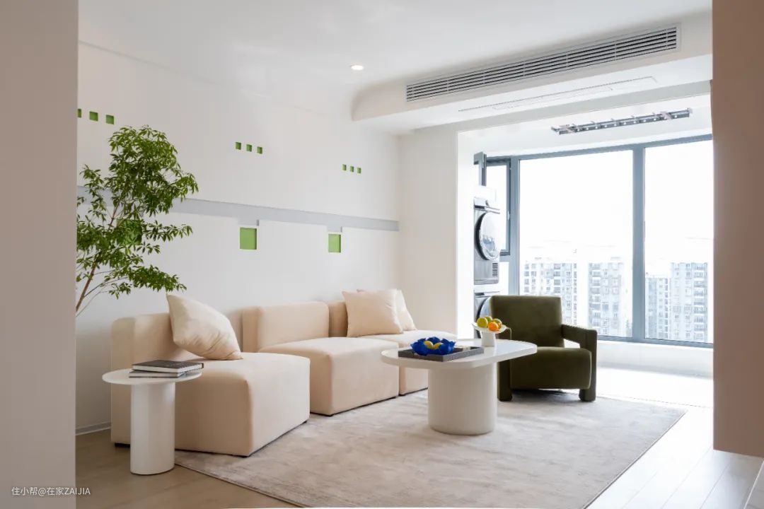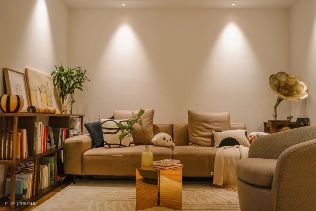 比如异形茶几,毛毛虫单人沙发椅,搭配一字型沙发,整个空间就很松弛,超有氛围感。