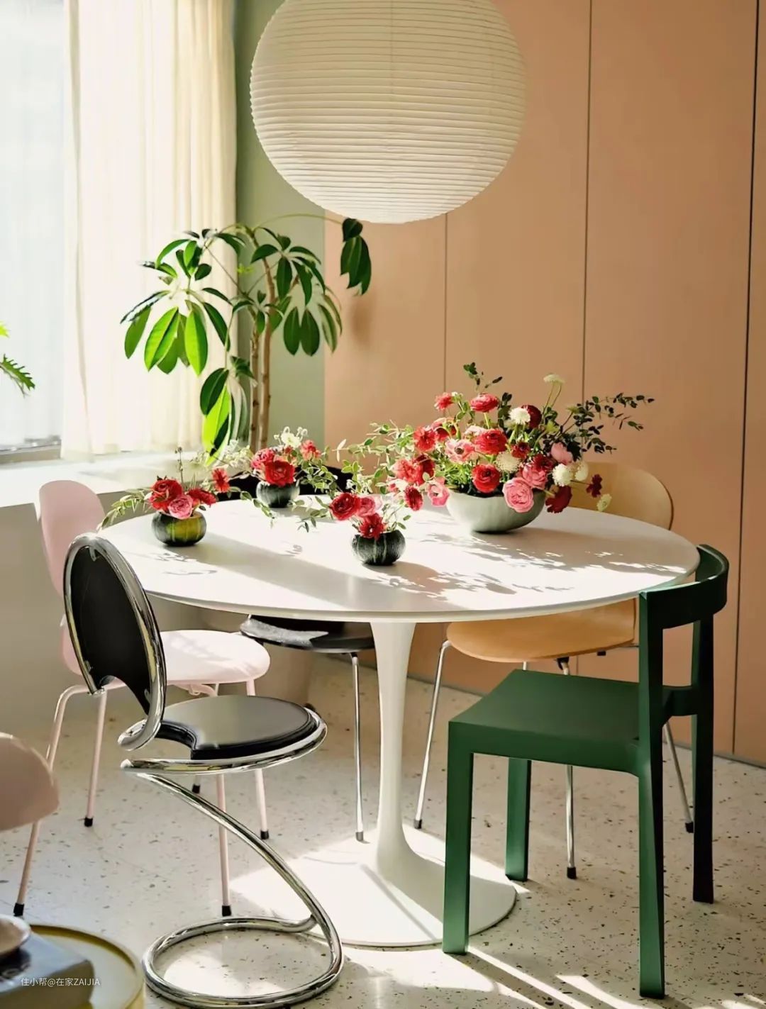 既然提到餐椅,宅妹还是那句话:餐椅不要只选餐桌官配款,不同造型、不同材质、不同颜色的餐椅进行混搭,会让你得到更松弛、更时髦、更有趣的用餐空间。