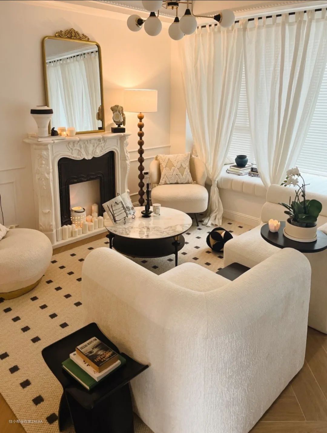 经典的野口勇茶几和弧形沙发堪称绝配,轻盈灵动,搭配棉花糖单人沙发,大理石边几,层次丰富,时髦又高级。