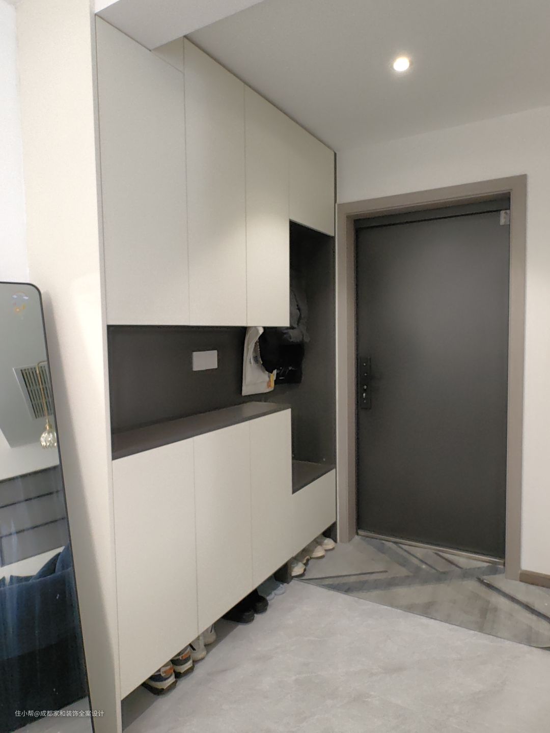 嵌入式鞋柜的设计,相对比较特殊,在确定玄关墙体可以拆除的前提下,才能这样做。敲完之后填墙,还有鞋柜,真的不错,合理利用空间。