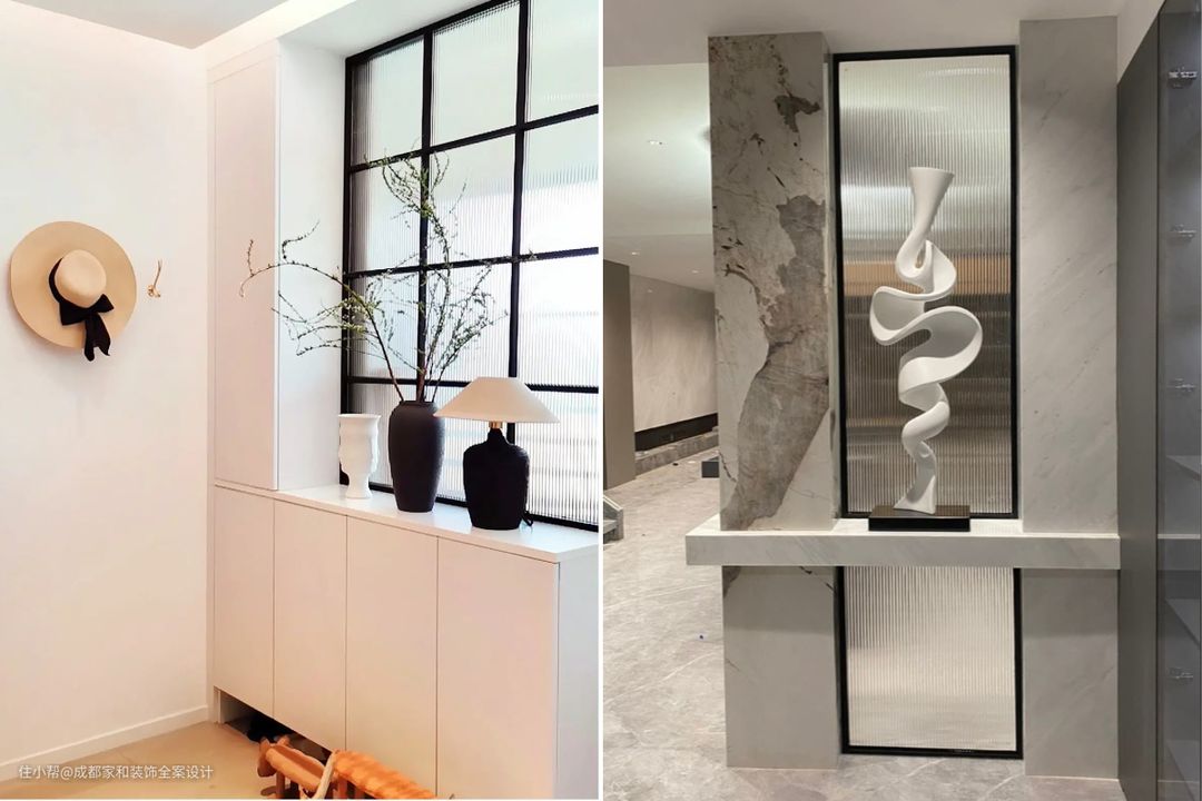 如果要利用鞋柜做玄关隔断,那么可以将柜子和玻璃隔断/格栅等相结合,这样不会影响玄关采光,装饰效果也不错。