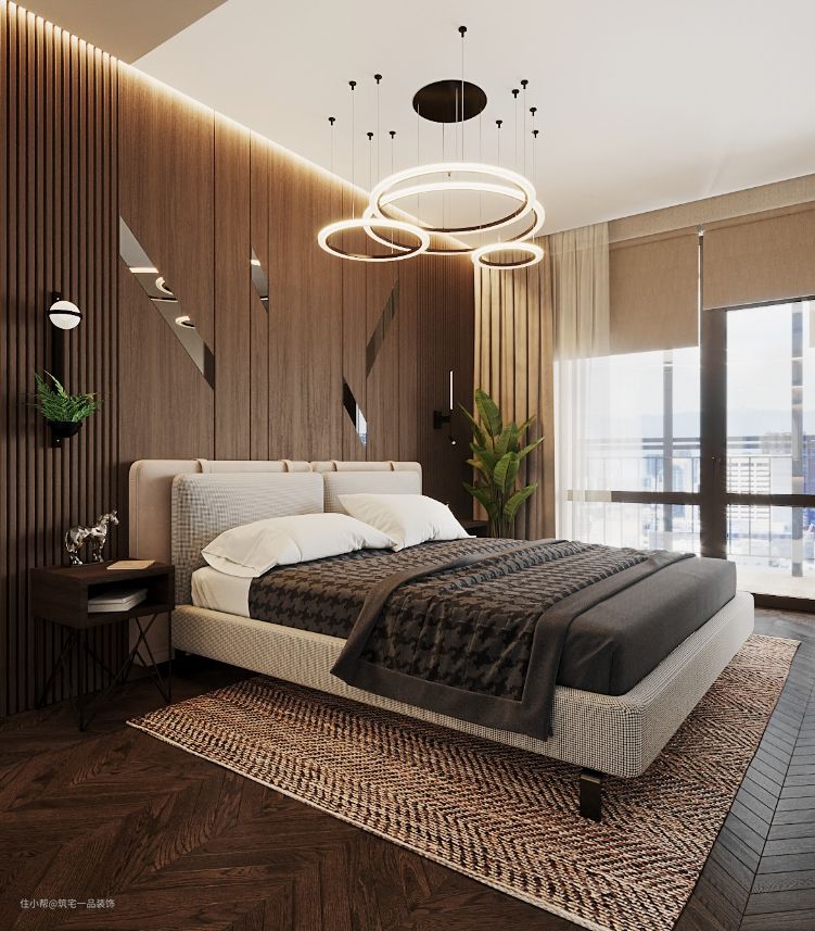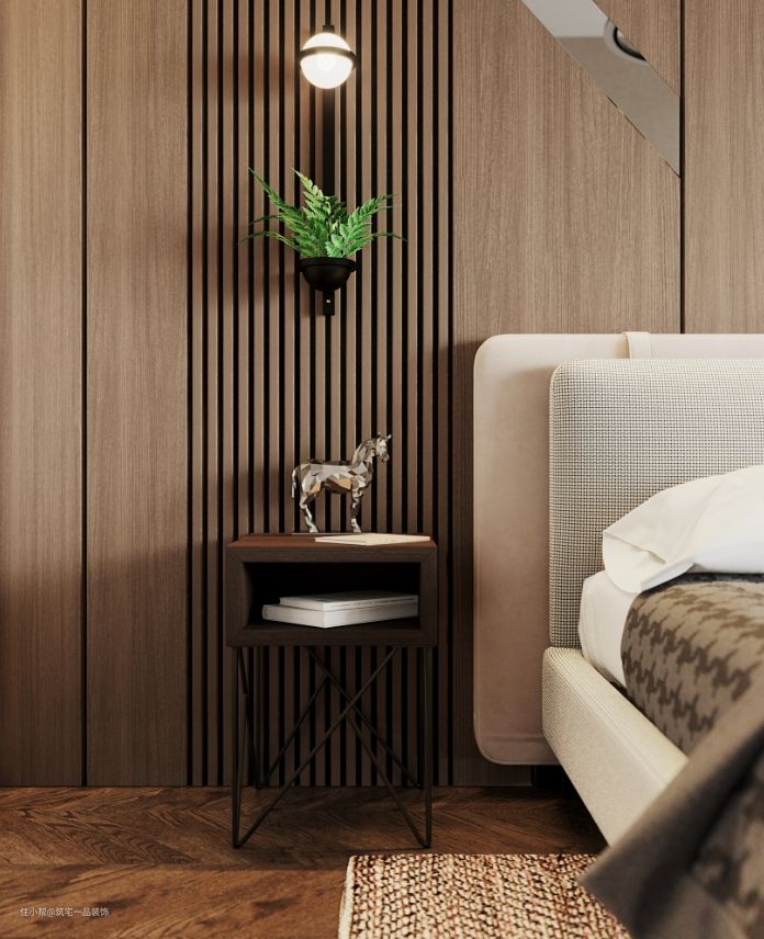 自然纹理和细节: 在卧室的装饰细节上,可以运用天然纹理来增加自然感。例如,在墙壁上使用天然石材进行装饰,或者使用带有木质纹理的装饰品,如壁画、手工编织的篮子等,营造出更丰富的视觉效果。