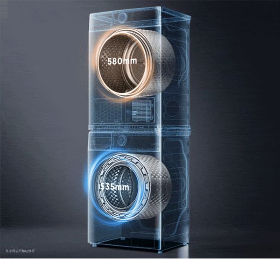 另外,在内筒设计上,小乌梅系列的洗衣机都是采用的535mm超大直径内筒,衣服在里面摔打路径更长,洗得更干净;烘干机的内筒直接升级到了580mm,可以充分抖散衣物,大件衣物也能一次烘干。