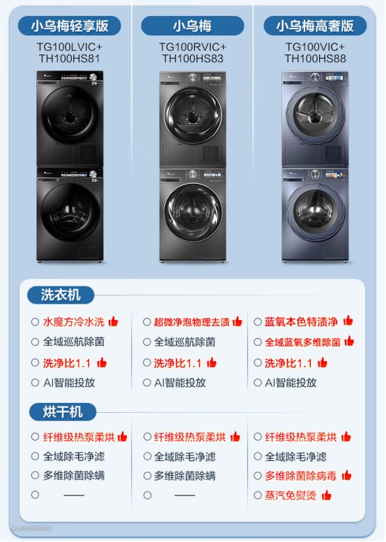 在这三款小乌梅洗烘套装里面,我比较推荐中间的旗舰款,原因是它支持超微净泡物理去渍功能,对于顽固污渍的洗涤效果更好,可以省水省电;如果预算充足也可以考虑支持蓝氧特渍洗的高奢版,瑾瑜蓝的配色方案和更薄的机身厚度在颜值上更上档次,而且全维除菌除病毒效果更好,更适合母婴家庭或皮肤敏感人士实用,如果有计划选购洗烘套装,在双11选择小天鹅小乌梅洗烘套装会是不错的选择。