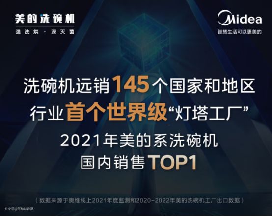 美的在洗碗机品牌中属于行业龙头地位,也是国内最大的洗碗机研发和制造企业,出口量占据了国内洗碗机80%,洗碗机远销145个国家和地区,并且建立了行业内唯一的世界级灯塔工厂,技术上在全球已经获得了105项专利。凭借着品牌影响力、先进的技术、可靠的产品质量和优秀的售后服务,在销量和口碑方面一直处于领先地位。