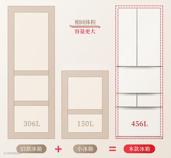作为一款456L的6门冰箱,机身尺寸只有深652mm*宽650mm*高1833mm,可以满足全嵌入式安装的需求;在容量方面,东芝大白桃采用了原装进口的航空级保温材料,同体积的情况下可以多装150L容量,相当于1台普通冰箱+1台小冰箱的容量,能有效节约厨房空间。