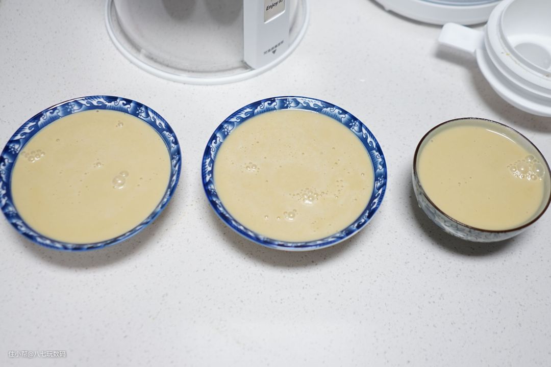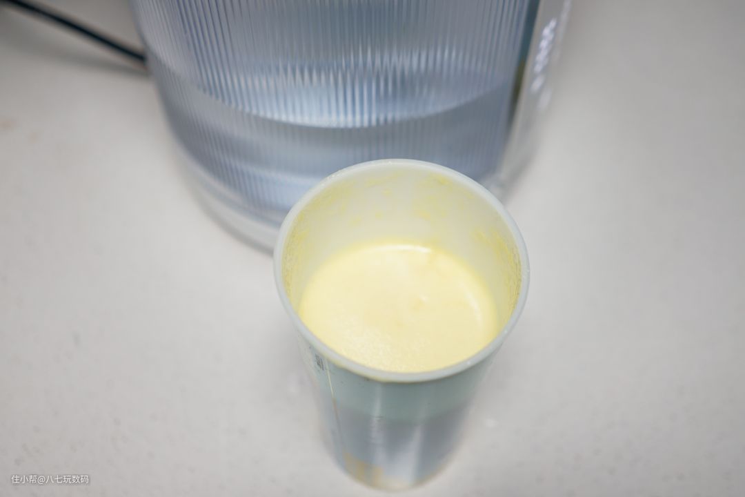 打开杯盖倒出豆浆如水一般非常丝滑,侧面也证明了豆浆无残渣,研磨的非常充沛细腻。一顿营养丰富的豆浆就大功告成了,初尝口感非常柔和细腻。很多破壁机会有糊味,而蓝宝PB08蒸汽破壁机独特的蒸汽加热技术,不设计涂层也不会糊底。