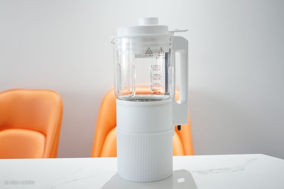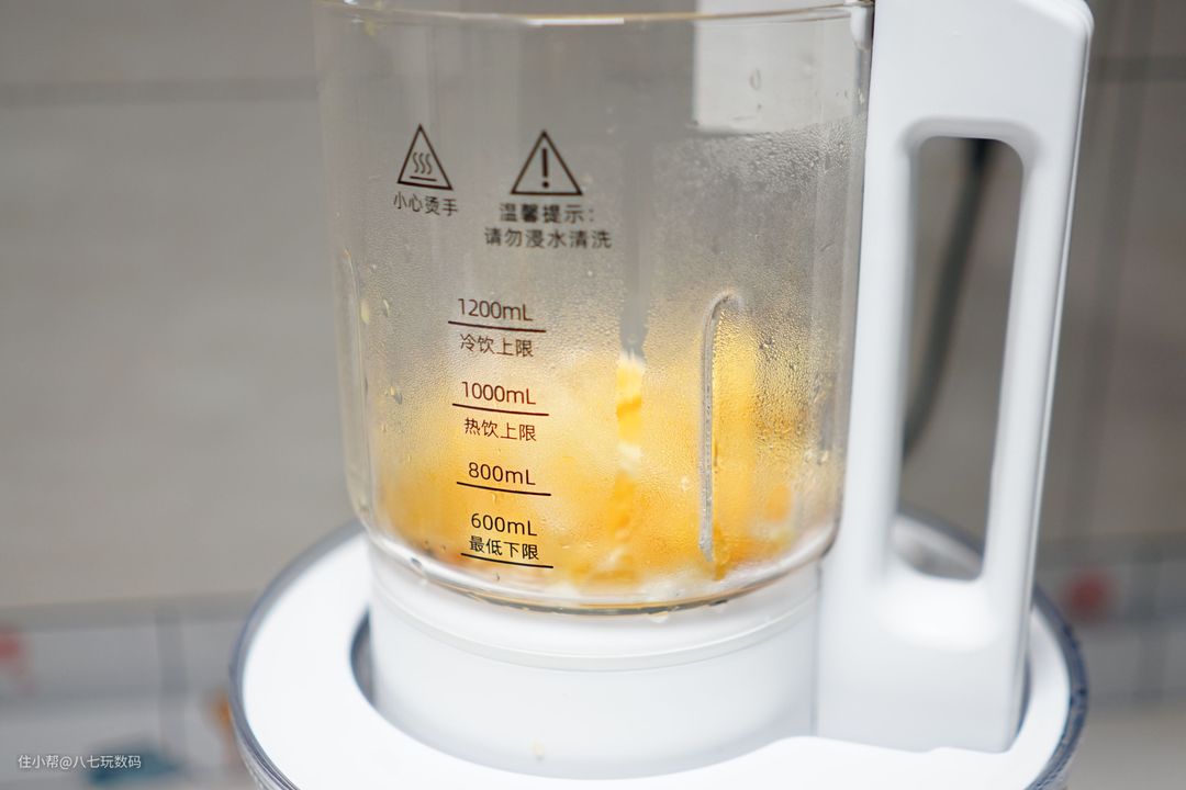 蓝宝PB08蒸汽破壁机采用了加厚高硼硅玻璃杯,侧面印有温馨提示,同时还有刻度提示,其中上限值为1200mL,高于此上线很容易造成溢出。