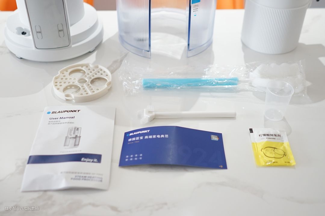 清洁刷可以作为一键清洗后的进一步处理使用,清洁刷可以清理不锈钢刀头,量杯取用食材更加准确一些,量杯采用了塑料材质,量杯的容量非常小,建议后期容量更大一些,采用玻璃材质更安全安全健康。破壁机的使用说明书,内有个部位的详细介绍,以及不同食材的详细操作流程,方便新用户进行快速上手,也可以当做一个简单的料理说明书使用。