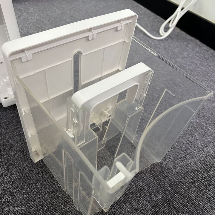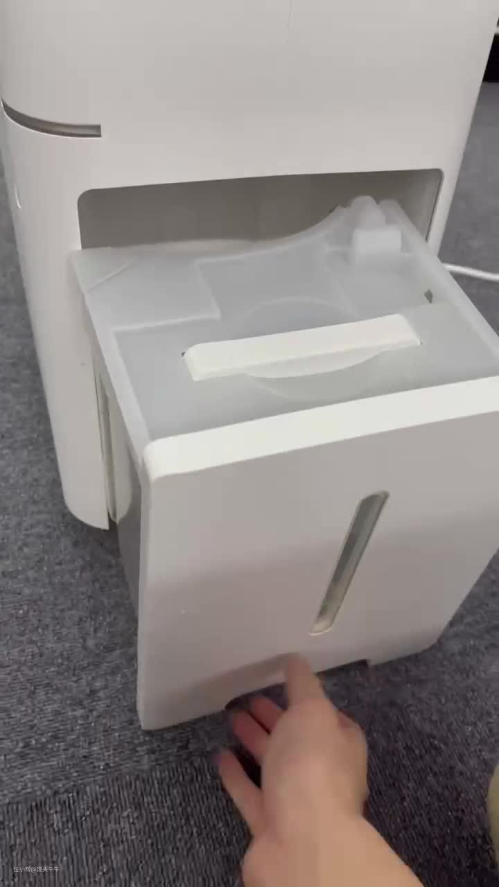 除湿器侧面是一个可抽取式的水箱,在除湿器侧面下方有一个很明显的凹槽,配合水箱导轨,可以在满水情况下,轻松将水箱给抽取出来,同时水箱的保护盖也可以如图所示单独给拆开再装回去的,更好方便的清洗水箱。不过还未使用过的水箱是有胶带贴住的,如果需要使用水箱还要先将胶带给撕开才可以。