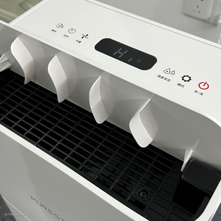 我们可以看到,除湿器的最上方就是功能面板了,功能面板的操作方式为触屏操作。日除湿量达25L,湿度调节可以在40%~80%湿度区间任意调节,一共有四种模式可供选择,分别为:送风模式、手动控制模式、睡眠(静音)模式、以及干衣模式。其它模式没什么好说的,我在这着重给大家讲一下干衣模式,因为这款浦力适X25有X-FLOW衣物速干技术,支持一小时快速干衣,这对于南方回南天的小伙伴非常友好,可以快速将衣物烘干然后出门。 我在家测试了一下,我们一家三口的初春季节的衣服,2个小时左右就能穿了。