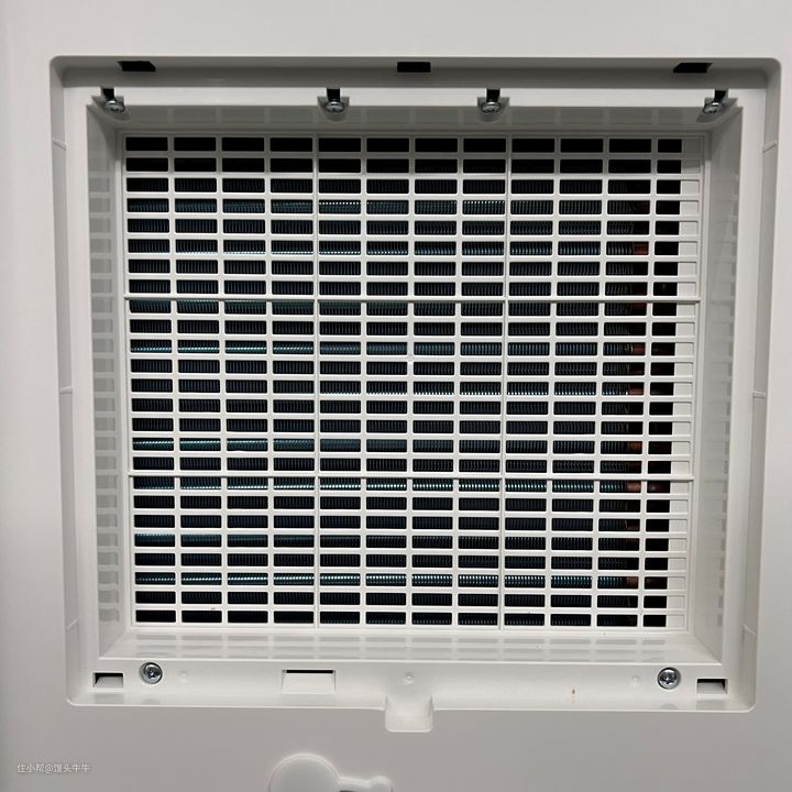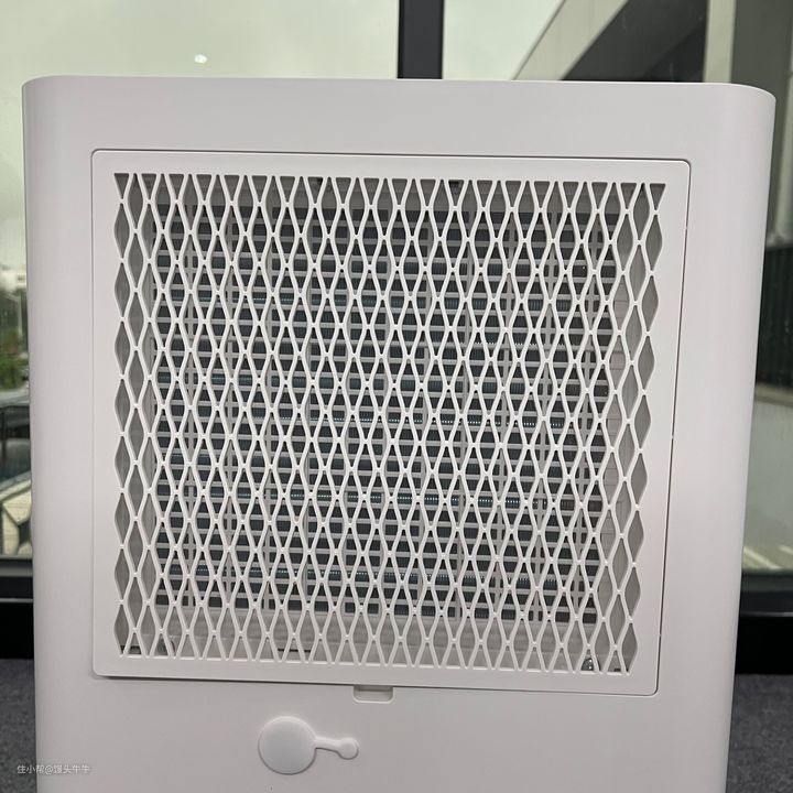 当出风口自动打开的时候,默认下是以90°角打开,风量也是不小的。可以看到出风口里面还设计了方形铁网,用来防止隐蔽异物掉落在除湿器内部造成除湿器损坏,出风口面板上还有波浪形的风导轨,风导轨的设计是用来柔和且快速让风吹到室内各处的。