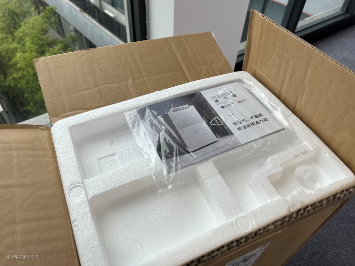 迫不及待地拆开外包装的瓦楞纸后,首先映入眼帘的是最上面的说明书,然后发现整台除湿机都被很厚的一层泡沫板给包裹的严严实实,可以说是完全杜绝了因快递员暴力运输造成物品损坏的问题,非常的贴心。