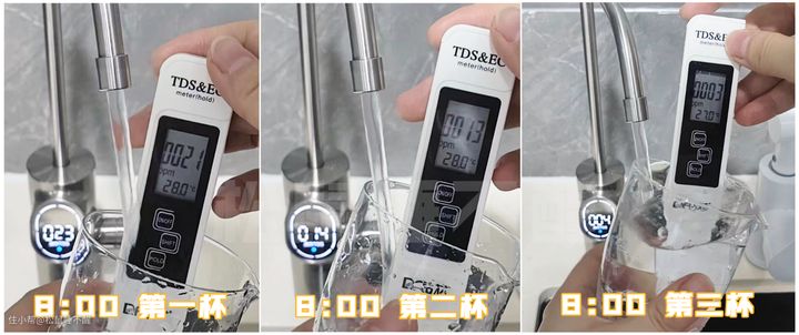我特地挑了三个间隔比较久的时间段,对头3杯水进行TDS测试。