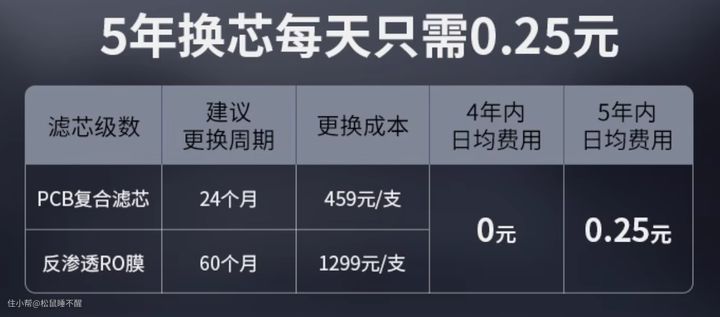 这么算下来,前4年是没有任何费用的,顶多就是在第五年初换一次PCB复合芯,平摊下来,前五年每天不过二毛五!