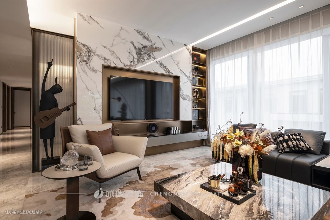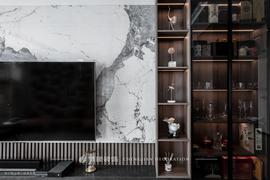 这类设计中的电视柜不单一的局限于具体的某一个位置,可以是底柜,可以是侧边柜,当然也可以是顶柜,甚至是两两结合的布局;同时还会融入其它材质的背景墙造型,像大理石、岩板、木饰面等等。如何“排兵布局”,全看整体设计的美感。