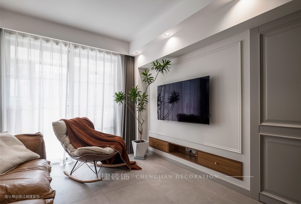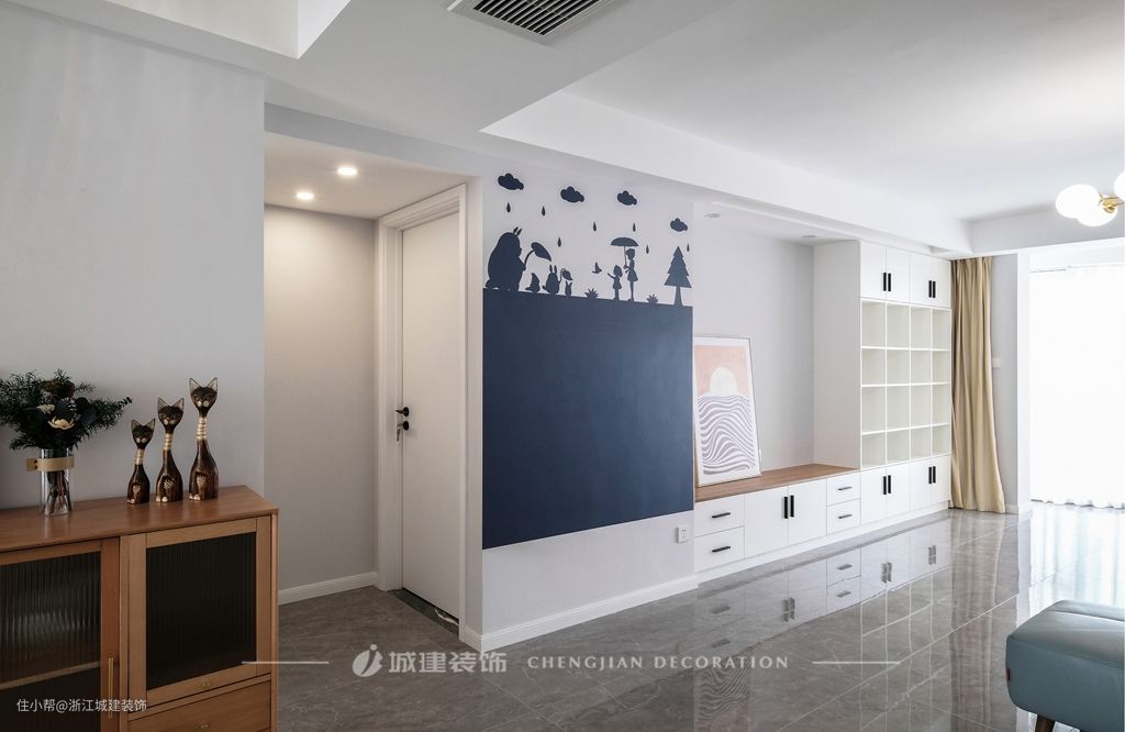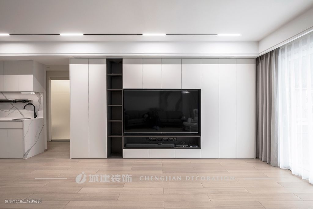 除预留出电视的位置,整面电视背景墙都以收纳柜的形式展现,插座位置留白处理,方便后期接入机顶盒,无线蓝牙设备等等。