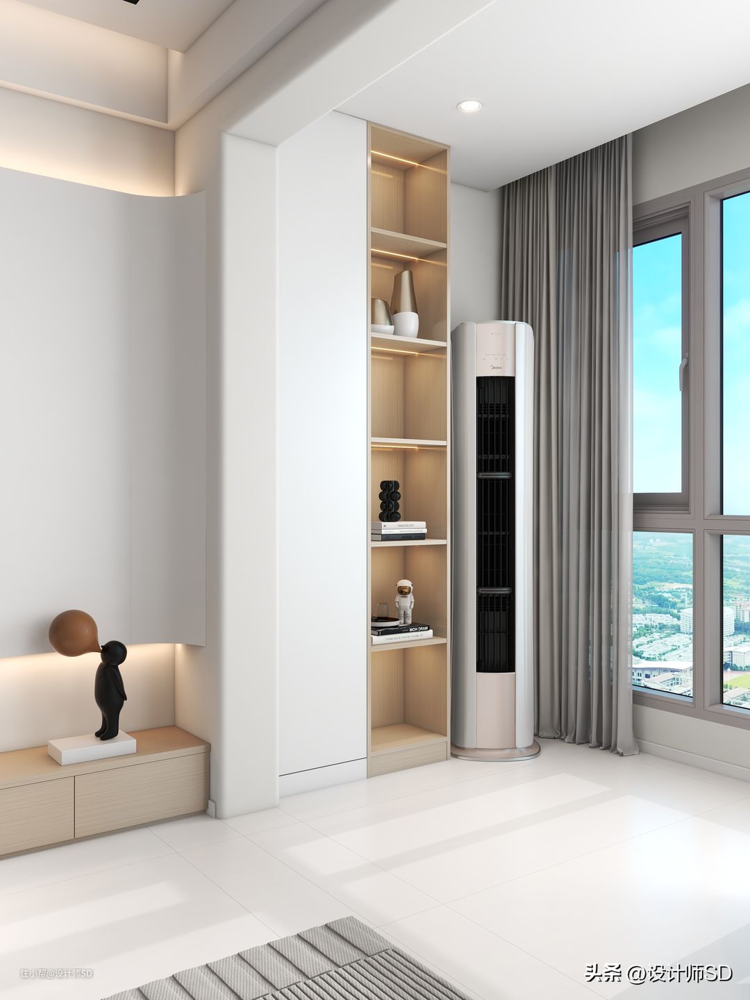 在柜体与落地窗的中间,布置了一台柜机空调,没有在顶面做风管机的布置。让整个背景墙的布置看上去简单清爽又很实用。