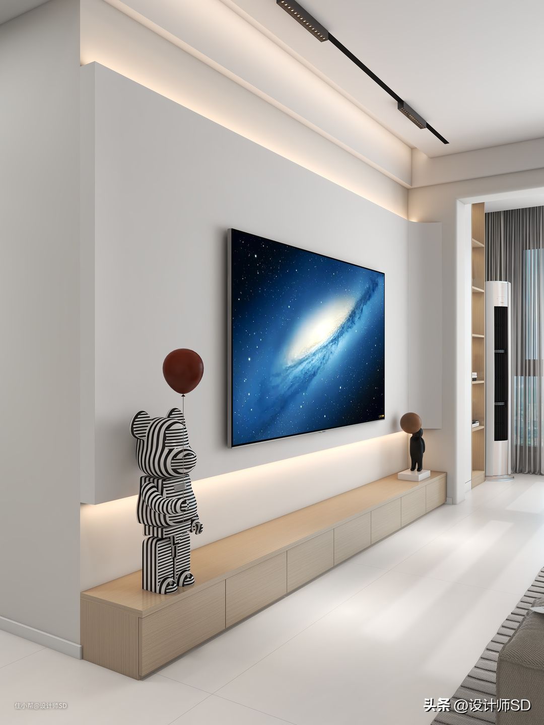 “电视背景墙”的布置看上去简约而不简单,在地面做了一排抽屉柜,门板跟台板都使用木色的板材,看上去很有质感,在背景的中间,让木工师傅打底,使用石膏板饰面,在右侧做了一点弧形的造型,看上去不那么生硬,再刷上白色的乳胶漆,上下搭配了两条灯带的布置。