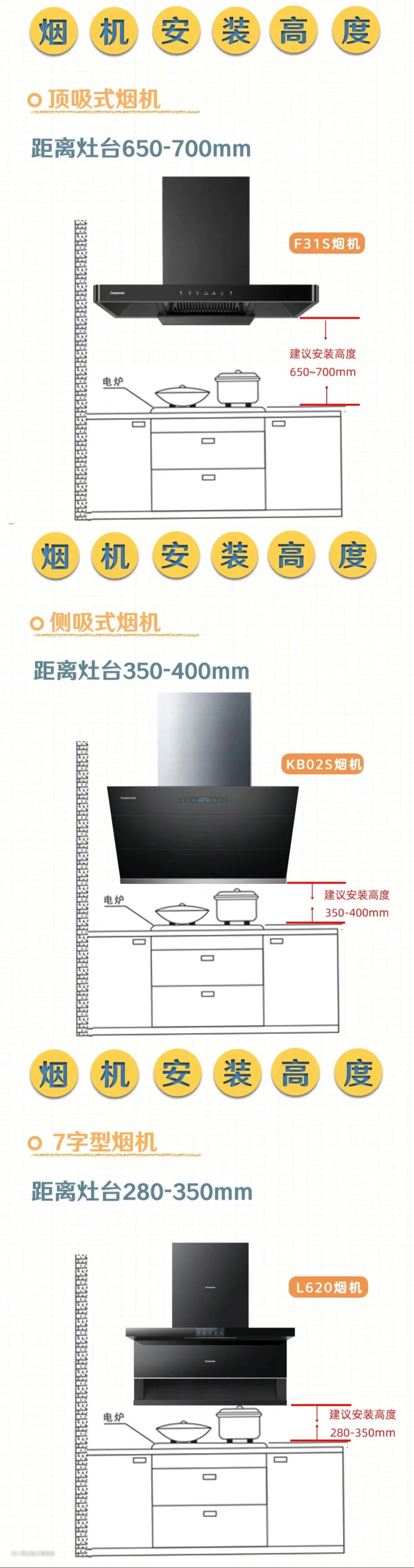 ⑵建议顶吸式油烟机高度在60—75cm,侧吸式油烟机高度在35—45cm