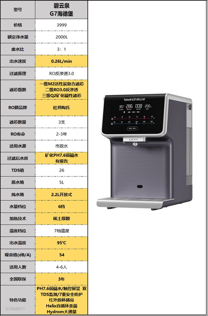 品牌净饮机各项数据中,黄色越多,代表该型号性能越优秀,性价比越高。红色则反之,代表该型号性能较之市面上其他产品稍差。一份价钱一分货,慎之。