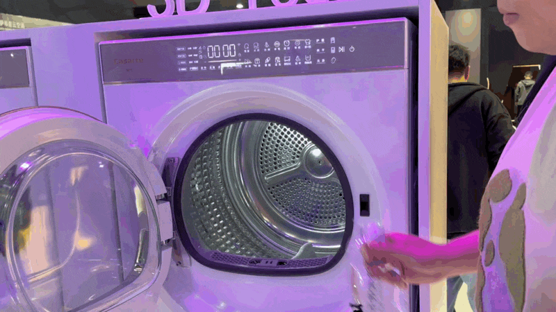 海尔在 2023年的AWE上刚刚向消费者展示了这项逆天技术:将透明水袋放入黑色布袋,模拟内部没有干透的厚重衣物。