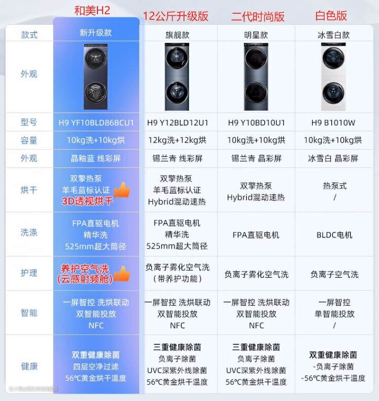 四款产品中,叠黛和美H2最为特殊,是今年刚刚发布的新品,而且拥有另一项行业内独一无二的新技术,我在后面单独展开。此处先对比①叠黛时尚版②叠黛10kg(初代)③叠黛12kg这三款机器。
