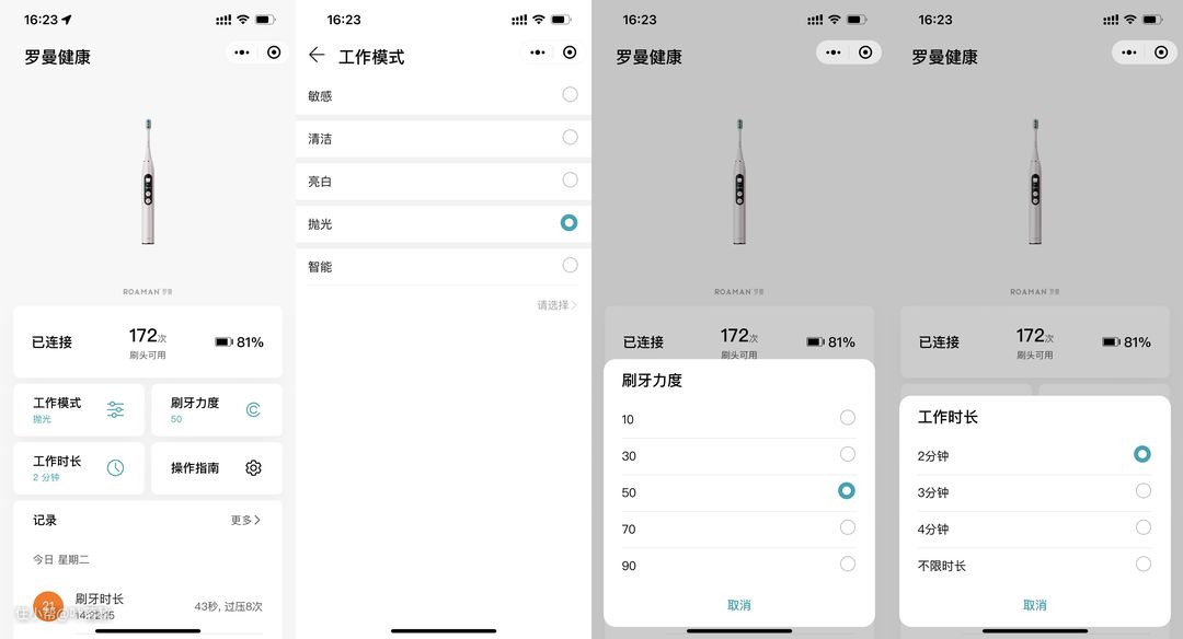 通过罗曼健康这个APP可以设置电动牙刷的工作模式、刷牙力度、工作时长,还可以查看牙刷的操作指南,能满足基础的使用需求。