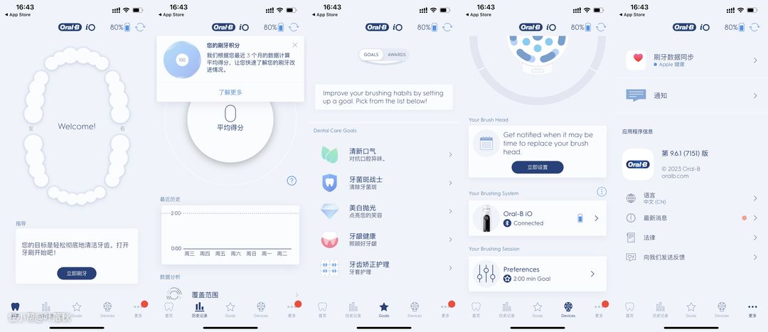 欧乐B的界面是中英混合设计的,主要功能是起到监测刷牙情况并给出打分的一个功能。