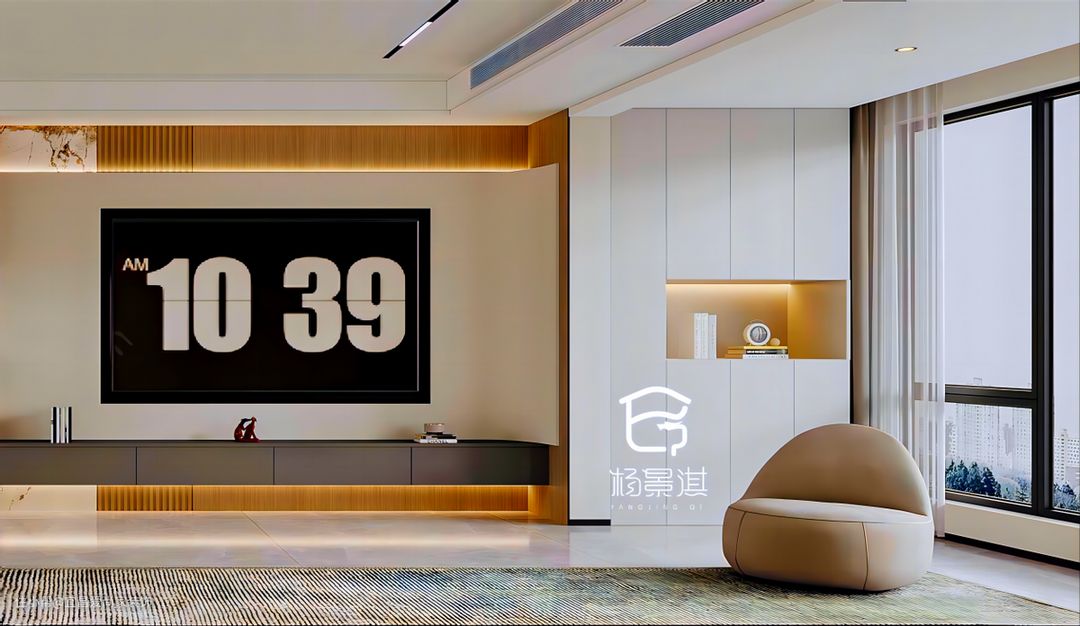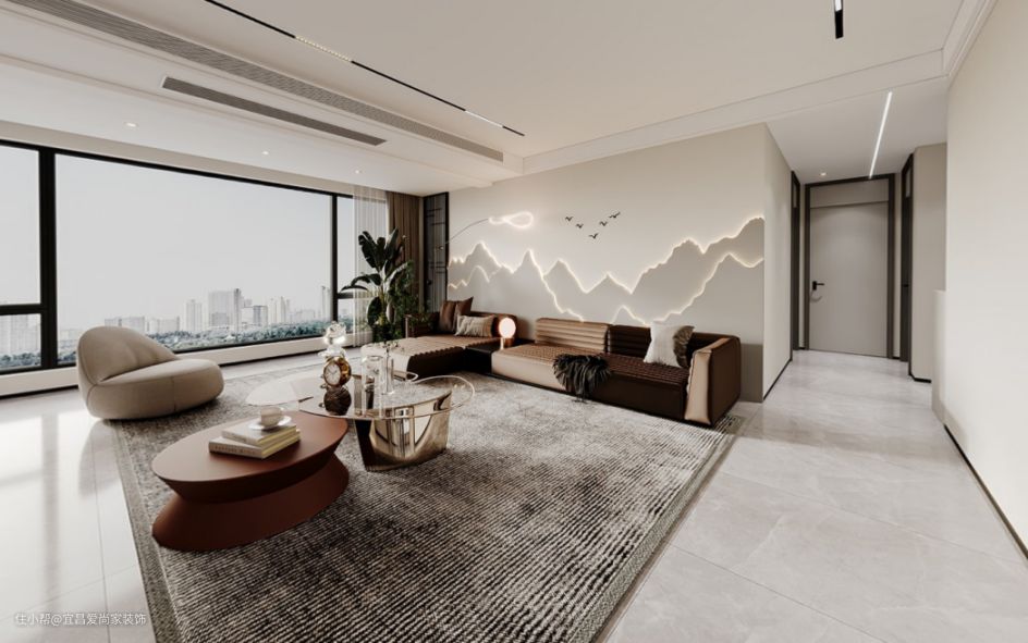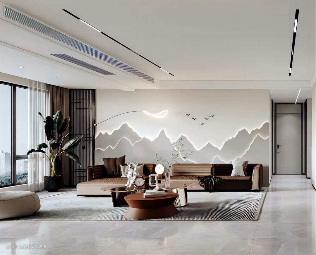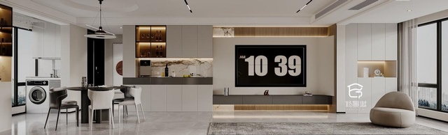 - 客厅采用无主灯设计,以射灯、灯带等代替主灯,营造层次感和氛围感更强的照明效果,墙壁内嵌的隐藏灯带也避免了照明死角的出现。同时也让空间更加显高显大。