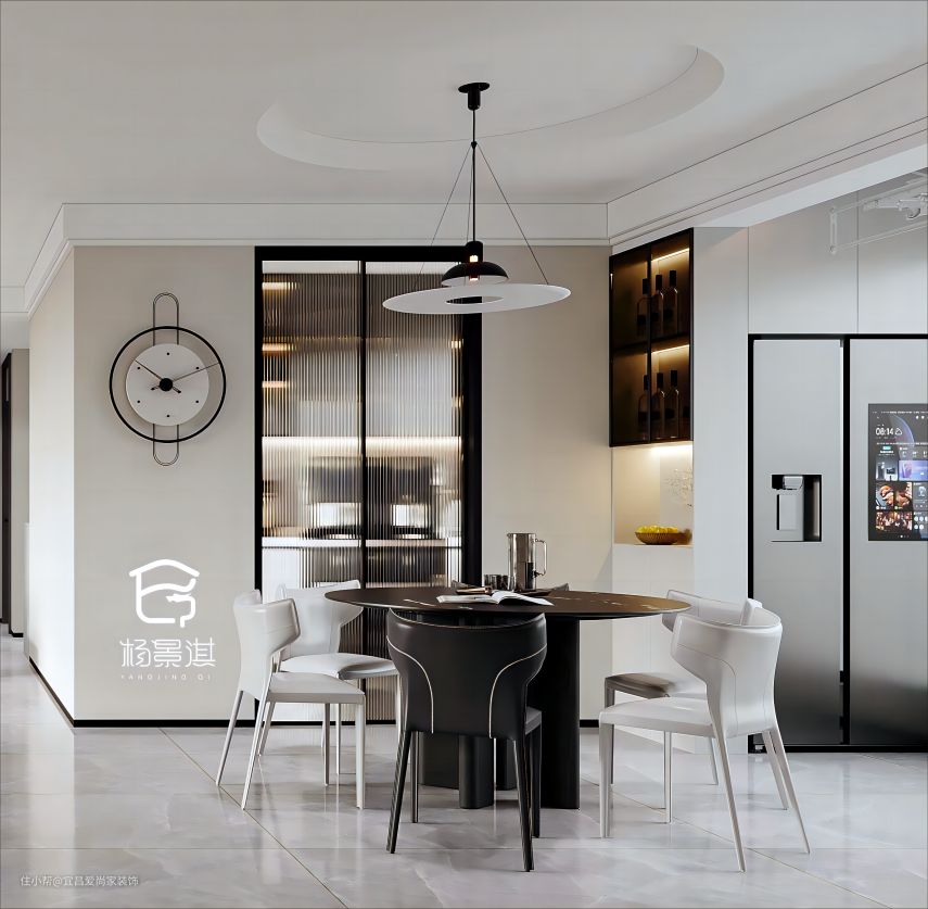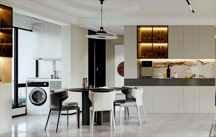 - 圆桌方椅,陈设雅致,圆形吊灯的装饰别有一番畅然韵味,在暖光灯下与家人围坐用餐,惬意自然。