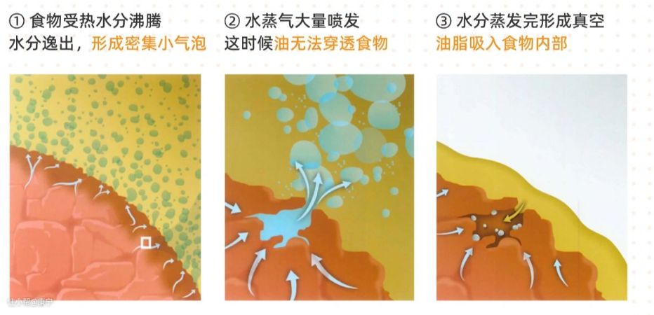 先来说明一下为什么油炸可以让食物变得香酥可口。油炸的过程中,沸腾的油温可以达到 200℃ 以上,同时水油不能互溶,食物表面的水分会在高温下迅速跑走,产生大量的气泡,同时发生美拉德反应和焦糖化反应,促使食物形成酥脆金黄的外壳。