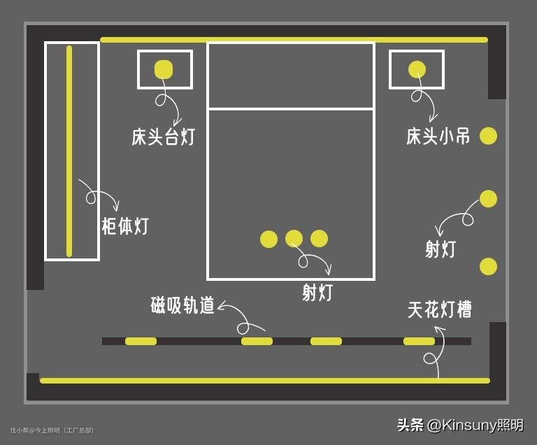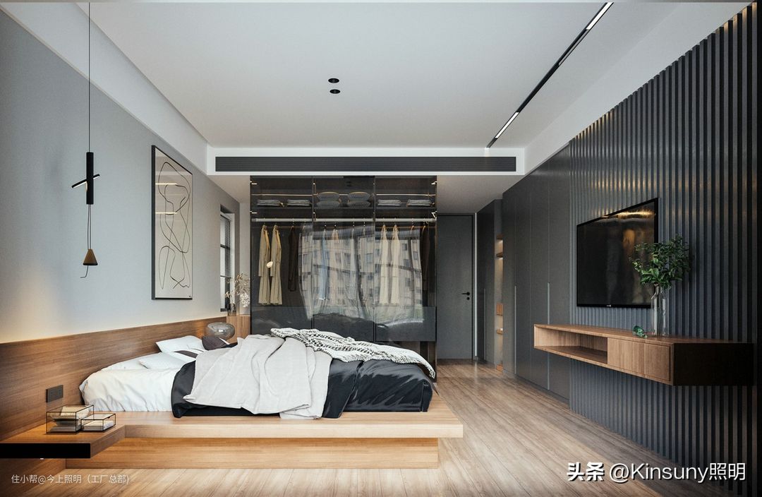 ③床尾及床尾过道区域——磁吸轨道灯提供重点光,为天花增添一份线条几何美感,可以自由推移、自由选择筒射灯的磁吸轨道灯更加灵活,可以满足更多的灯光需求