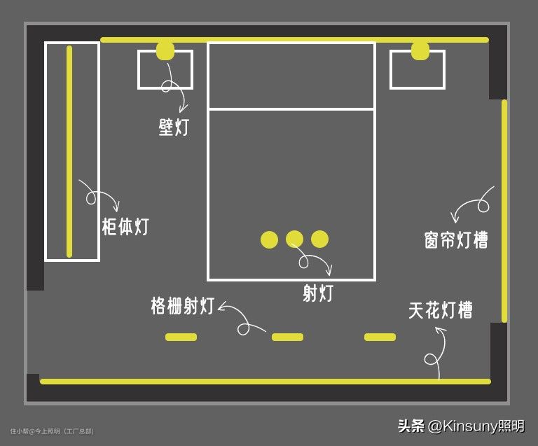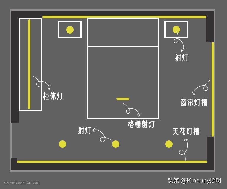 卧室的灯光不需要太亮,满足日常生活所需即可,建议选择色温3000K-3500K的灯具,暖黄的灯光更加温馨,低色温灯光里蓝光成分较少,适合睡眠和休息。卧室的灯光布局需要遵循“哪里需要照”、“怎么照”、“用什么照”的照明设计逻辑,下面有3个灯光布局方案可以参考。