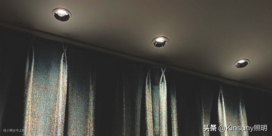 ④窗帘区域——射灯提供窗帘照明,射灯对窗帘的细部质感以及褶皱的表达更到位,它的光对窗帘区域是比较完整的呈现,要注意射灯安装距离窗帘应该在35cm左右