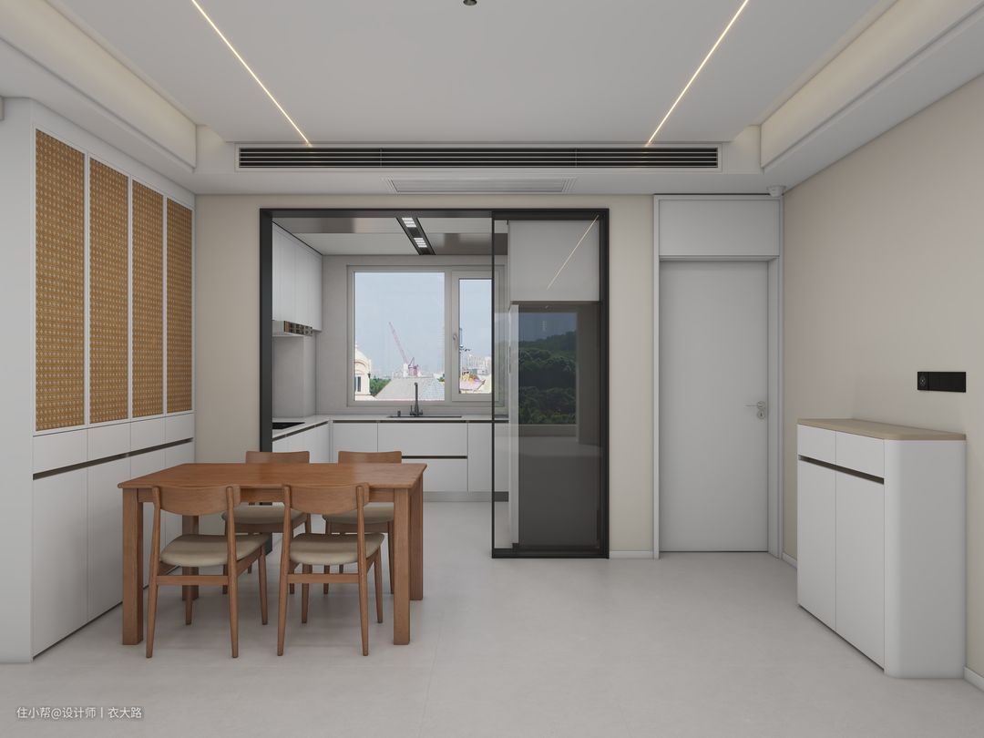 餐厅的餐桌采用原木色餐桌,跟整体色调一致。餐边柜没有采用烂大街的平板门搭配玻璃门的样式,而是采用与客厅一致的竹编门,相比玻璃门,竹编门显得更有质感、更高级,也与客厅柜子颜色样式相呼应。因为客厅阳台一体式悬浮顶的缘故,中央空调被安排在了餐厅区域,但并不影响空调的制冷效果。