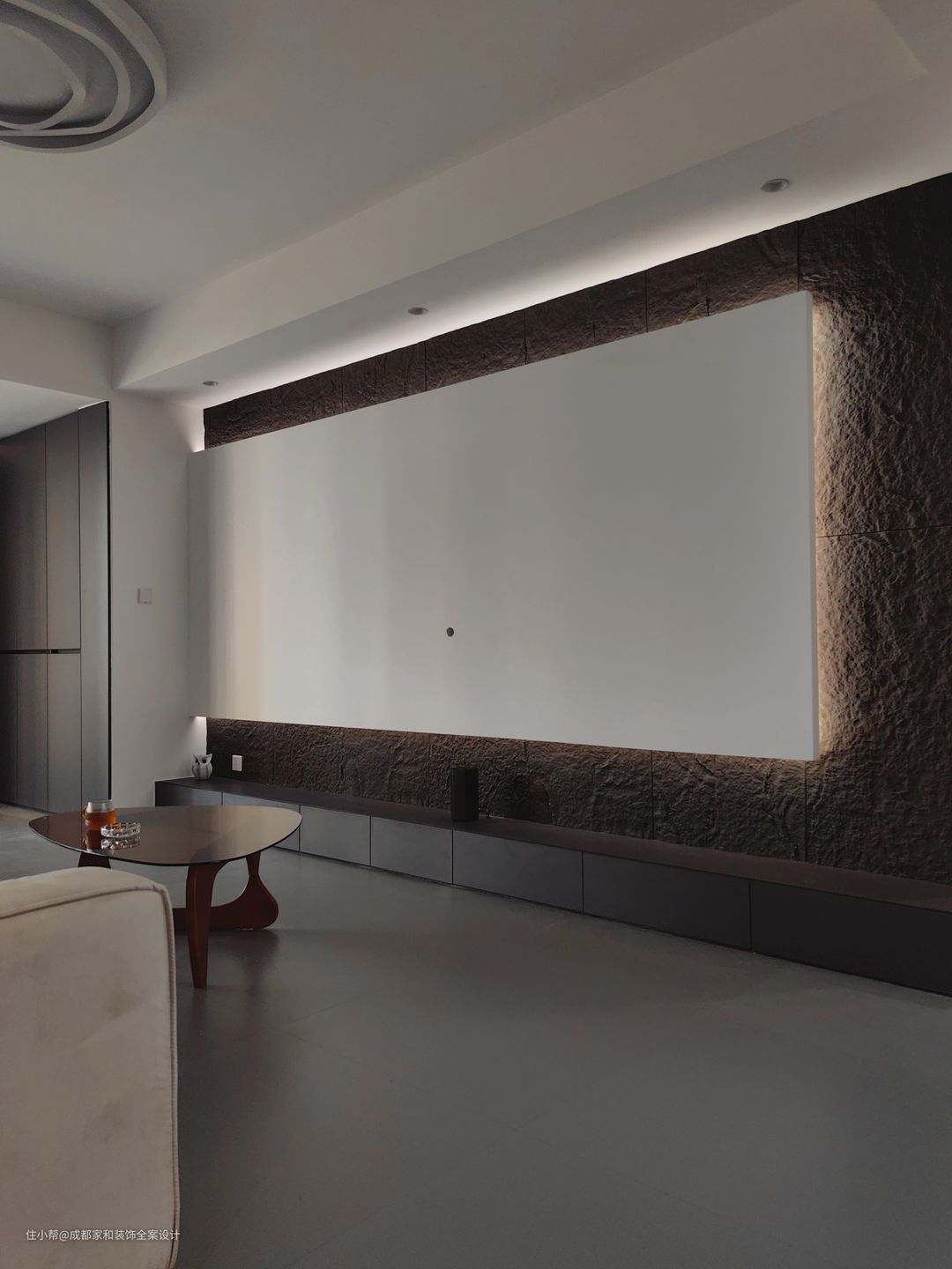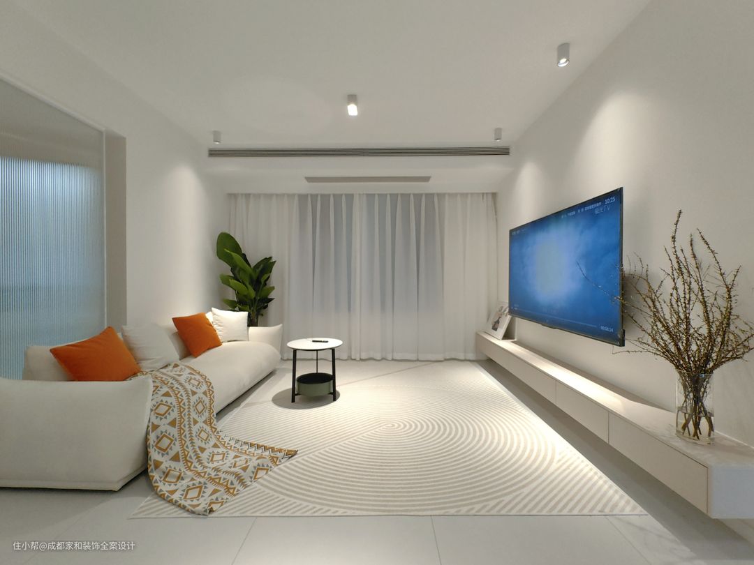 大平顶跟无主灯设计也是好搭档,大平顶就是在天花做满吊顶,用筒灯射灯照明,整个顶面视觉统一,有种低调的高级感。