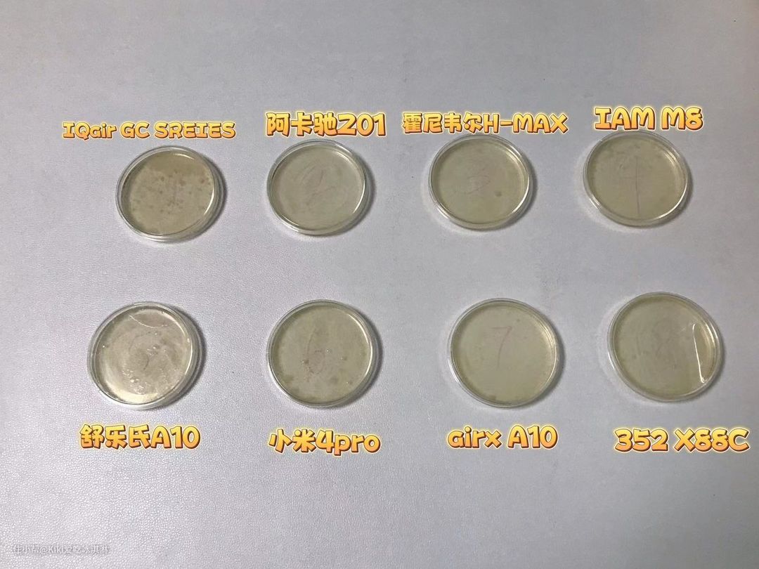 从图上可以看到,有几款测试后的培养皿里明显可以看到有细菌残留。表现比较好的是352 X88C,几乎看不到培养皿里有细菌,除菌效果非常明显。、