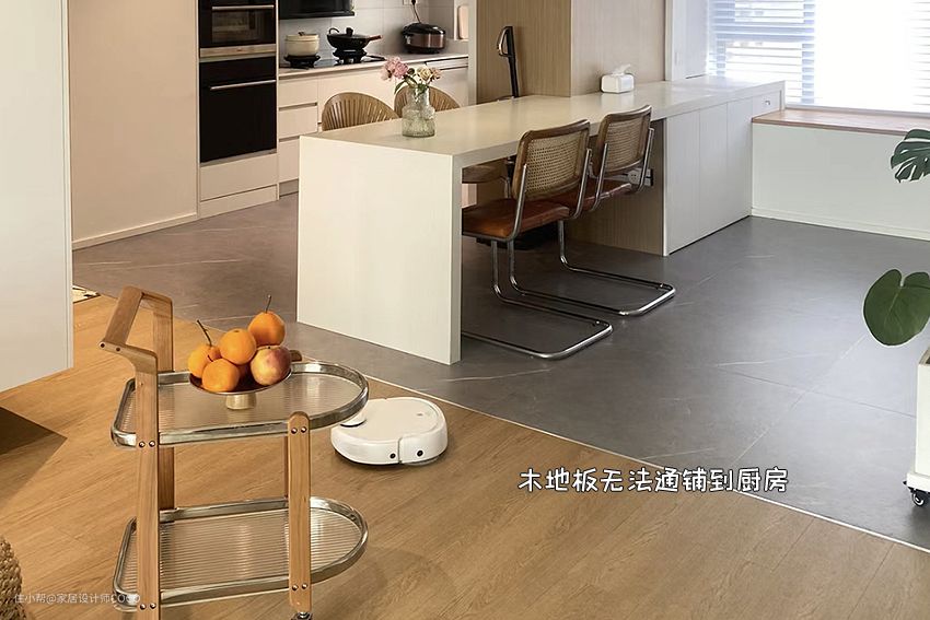 通铺是目前地面最流行的做法,可以家的空间显得更大,但是有些地方却不可以用木地板来通铺,例如:厨房空间、开放式阳台等这些需要考虑干湿分离的空间。