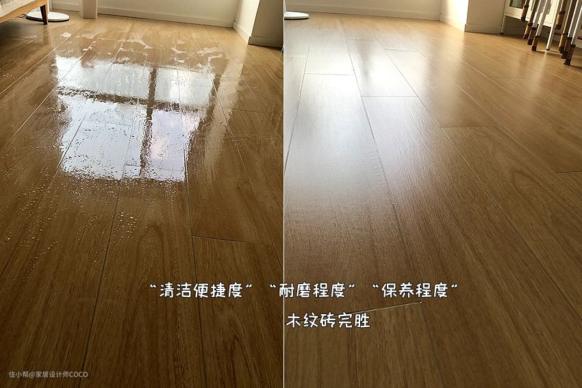 所以,“清洁便捷度”“耐磨程度”“保养程度”这3个方面,就省心程度来讲,木纹砖的优势要明显大于木地板,而且“使用寿命”也要比木地板更久。