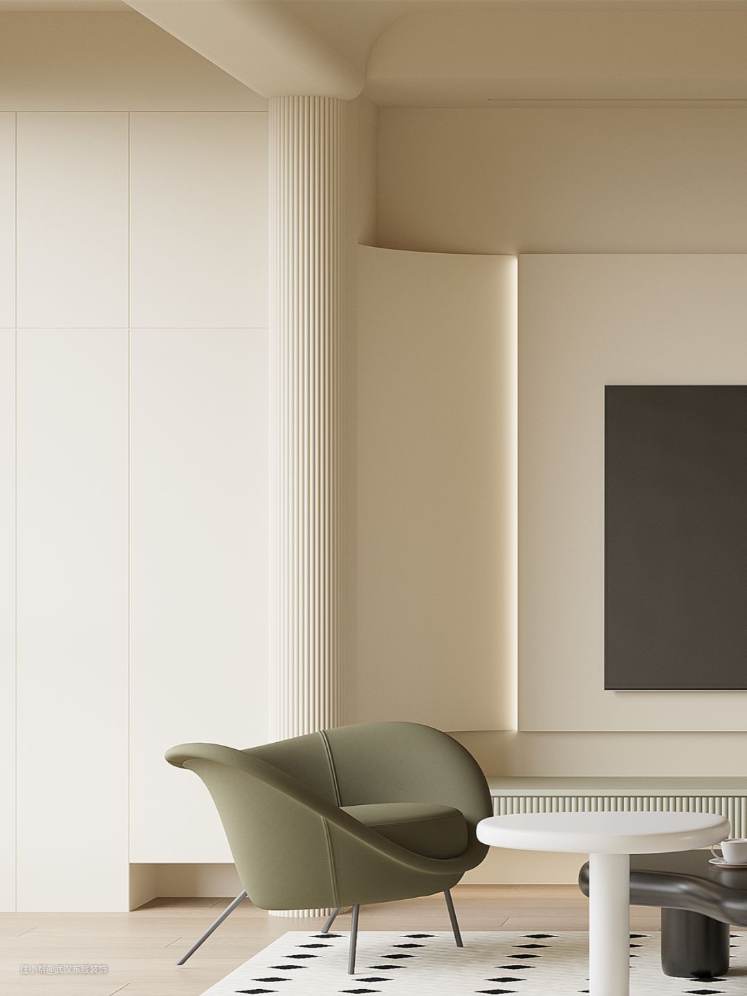 阳台与客厅之间无法拆除的承重墙,可以选择圆弧处理,弱化存在感,让整个空间更协调更有质感。