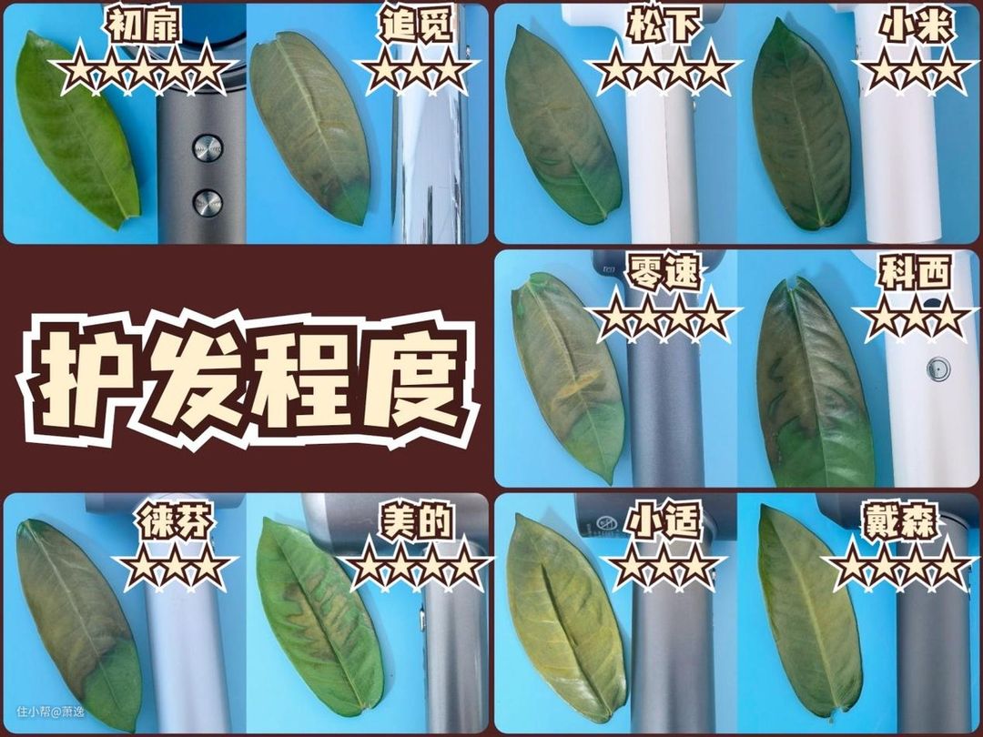 这几款吹风机能从图片明显观察到叶子严重变色,说明吹风机可能会对头发损伤度比较大,长期使用可能导致头发干燥枯黄,水分流失的情况出现。虽然干发速度很快但是没有兼顾好头发柔顺保护度。