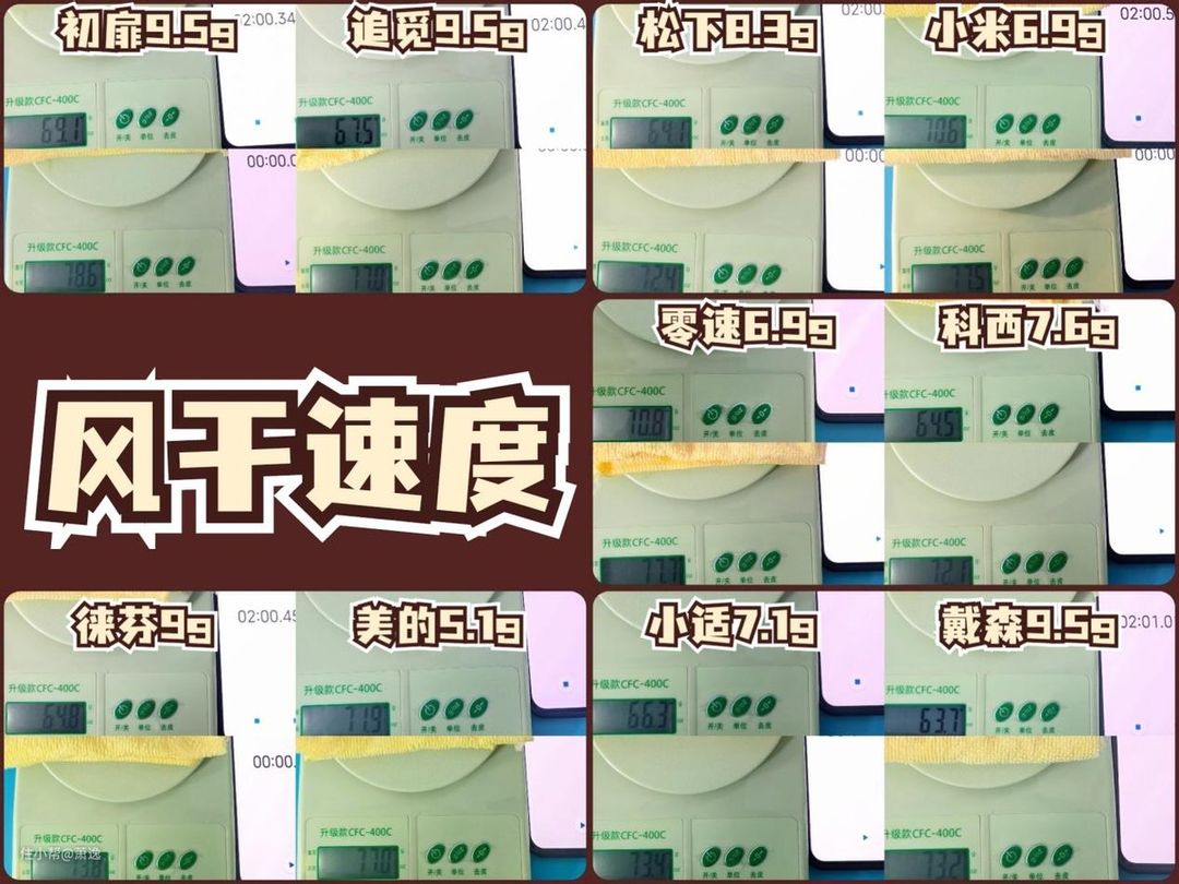 测评方式:将一块小毛巾打湿称量重量,用各款吹风机的最大档风速最大档温度在固定距离的情况下吹一分钟,然后测量毛巾的重量,对比水分减少的多少。
